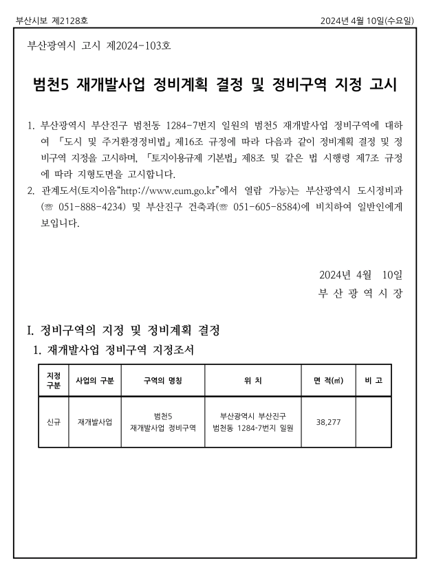 범천5구역은 4월 10일 정비구역 지정고시가 되었습니다.