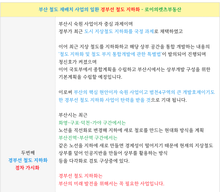 추가로, 경부선철로 지하화 역시 진행이 되면 더욱더 접근성 및 생활 환경이 크게 개선됩니다