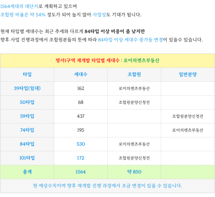 명서1구역 재개발 추정 타입별 세대수 소개 드립니다.