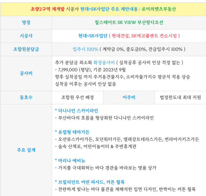 초량2구역 재개발 새로운 시공사 현대+SK 사업단 주요 제안 내용입니다.