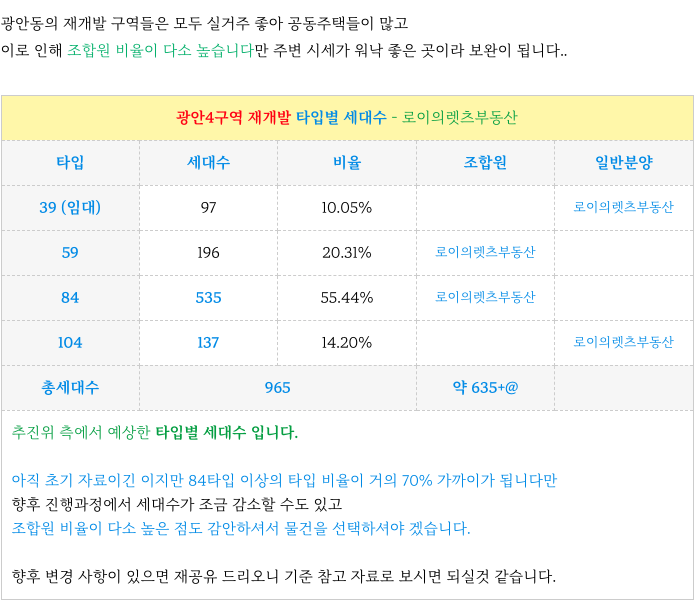 광안4구역 재개발 예상 타입별 세대수 정리 드립니다.