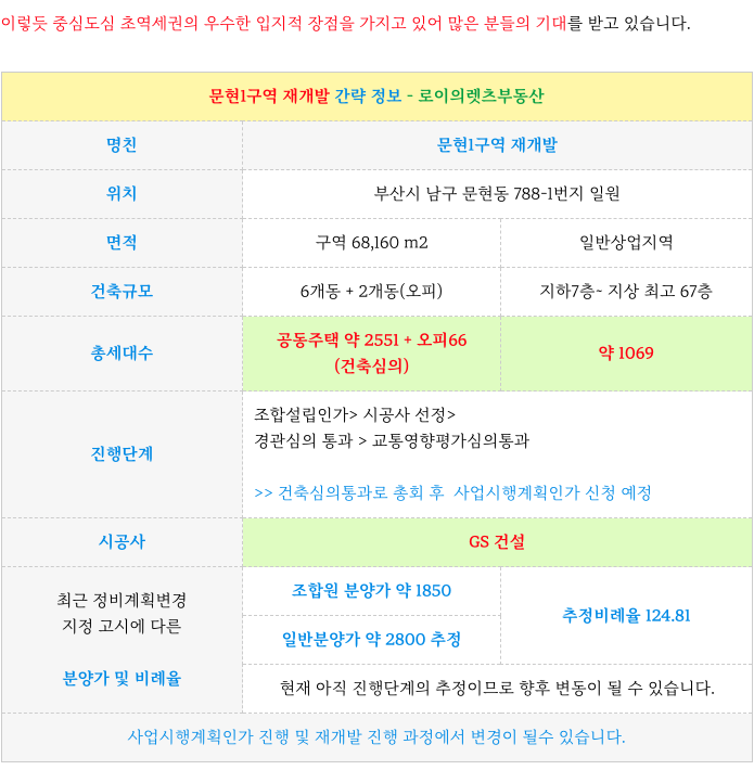 입지 좋은 문현1구역 진행 소식과 현 최저 매물 정리 소개하여 드립니다.