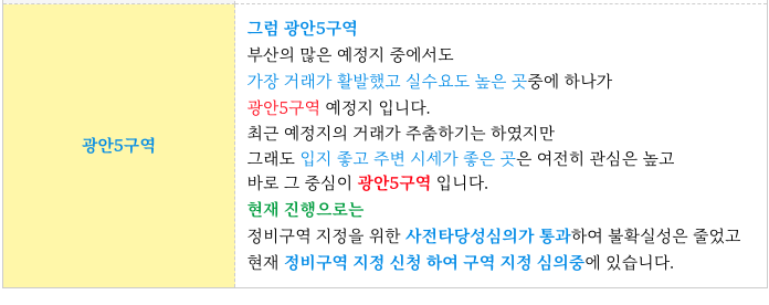 많은 분들이 관심을 가지고 이 불경기에도 그래도 조금씩 거래 되는데 그 곳이 바로 광안5구역입니다.