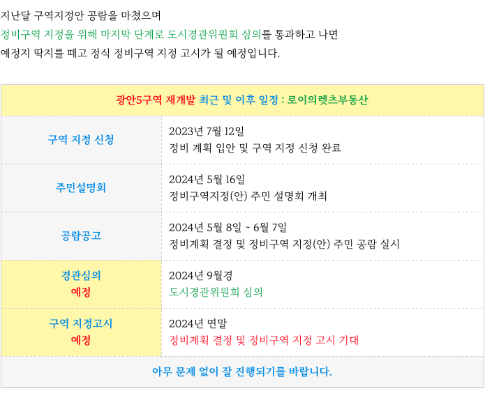 수영구 광안5구역 지금까지의 주요 진행 부분과 이후 절차 일정 등 추가 정보는 아래 페이지를 참조 부탁드립니다.