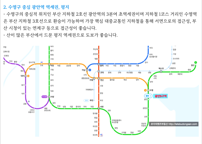 수영구의 중심 광안역을 바로 앞에둔 초역세권으로