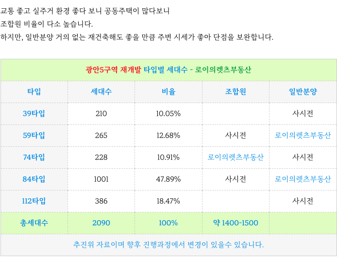 역세권 광안5구역 재개발 현 계획 타입별 세대수를 소개 드리겠습니다.