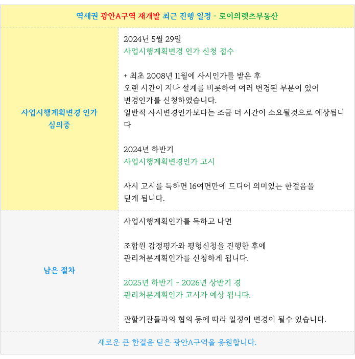 역세권 광안A구역 재개발 현재까지 진행사항 그리고 향후 일정 정리 및 추가 정보는 아래 페이지를 참고 부탁드립니다.