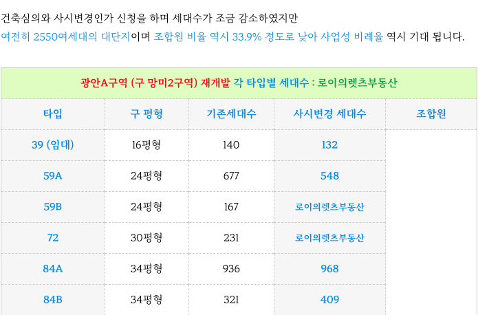 광안A구역 재개발 현재 계획 타입별 세대수 정리하였습니다.