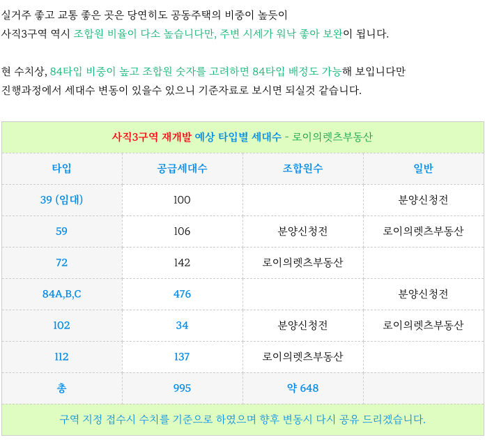 사직3구역 재개발 현 추정 타입별 세대수 소개해 드리겠습니다.
