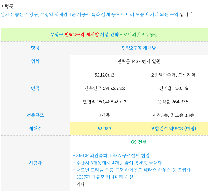 수영구 민락2구역 간략 설명 드린 주요 입지적 특징 소개해 드립니다.
