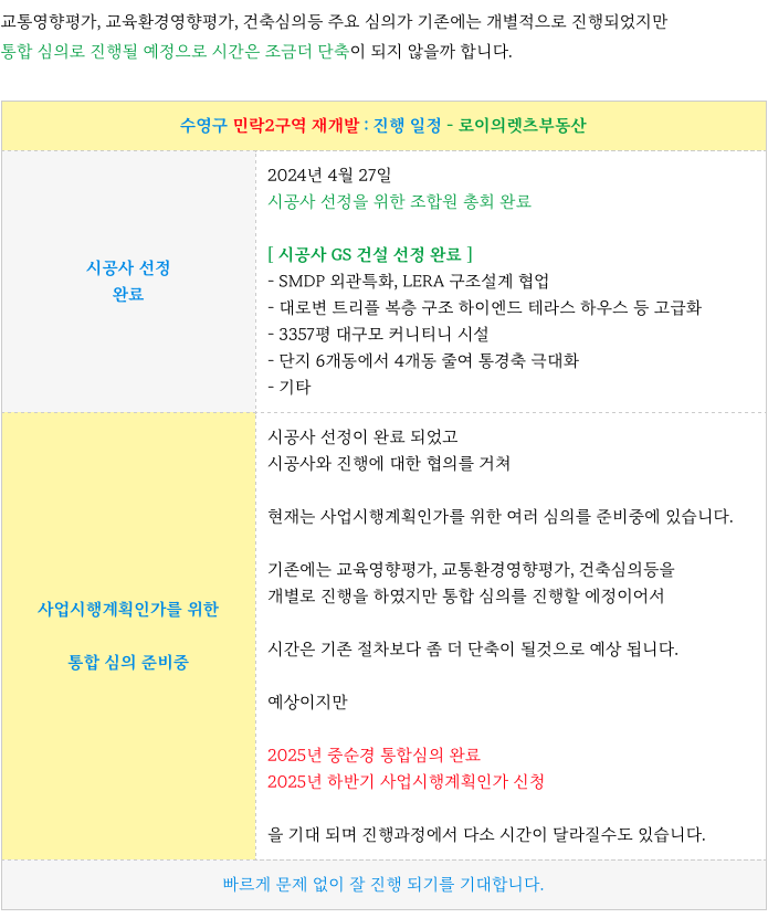 수영구 민락2구역 재개발은 사업시행계획인가를 위한 여러 심의를 준비중에 있습니다.