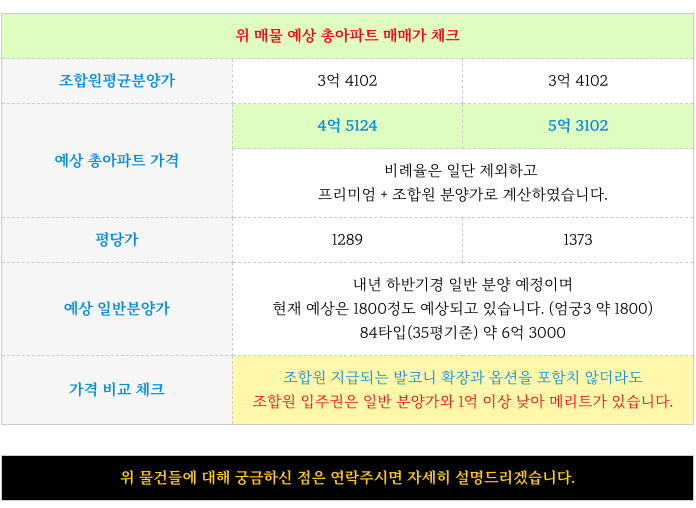 84타입 기준 조합원 분양가 평당 약 1000만원으로 그 어느곳과 비교할 수 없는 가격대이며