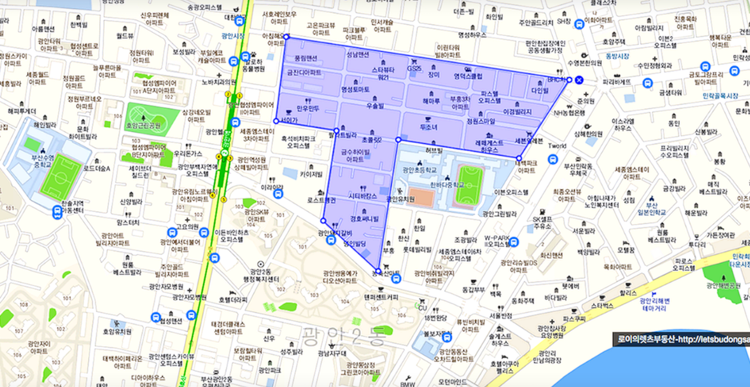 수영구의 중심 광안역을 곁에 둔 초역세권, 도보로 광안리 바닷가 누릴수 있는 재개발 구역 입니다.