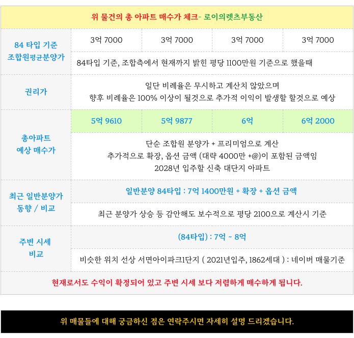 * 진행 대비하여 프리미엄이 낮고, 조합원 분양가도 낮고 일반분양가 그리고 주변 시세보다도 낮아