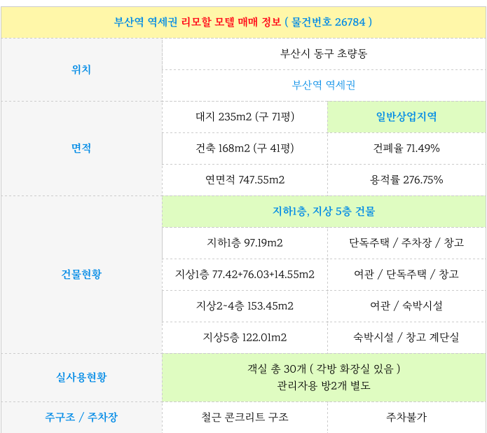 - 낮은 매매가로 큰 부담 없이 리모하여 게스트 하우스, 모텔 등으로 활용 추천