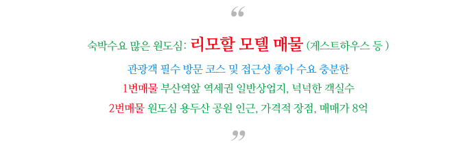 - 프리미엄 모텔이나 게스트 하우스로 리모델링 추천