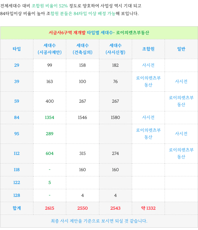 서금사6구역 재개발 계획 타입별 세대수 정리하였습니다.