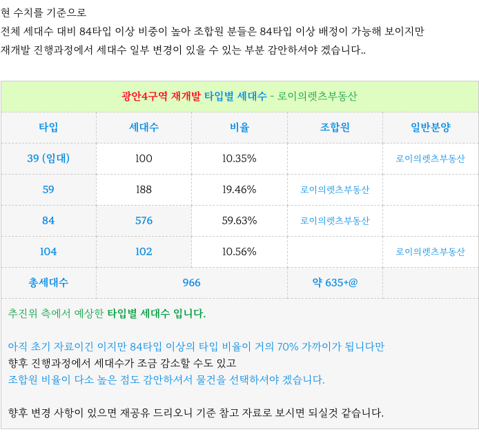 광안4구역 현 계획 타입별 세대수 소개해 드립니다.