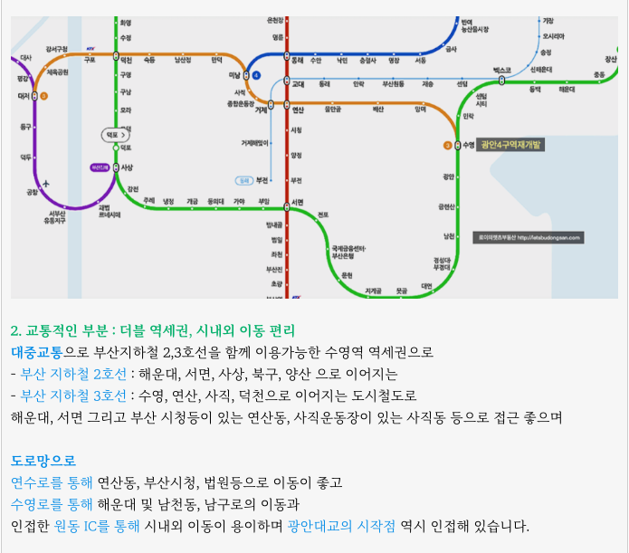 - 수영역 더블 역세권 : 부산 지하철 2호선, 3호선 환승센터.