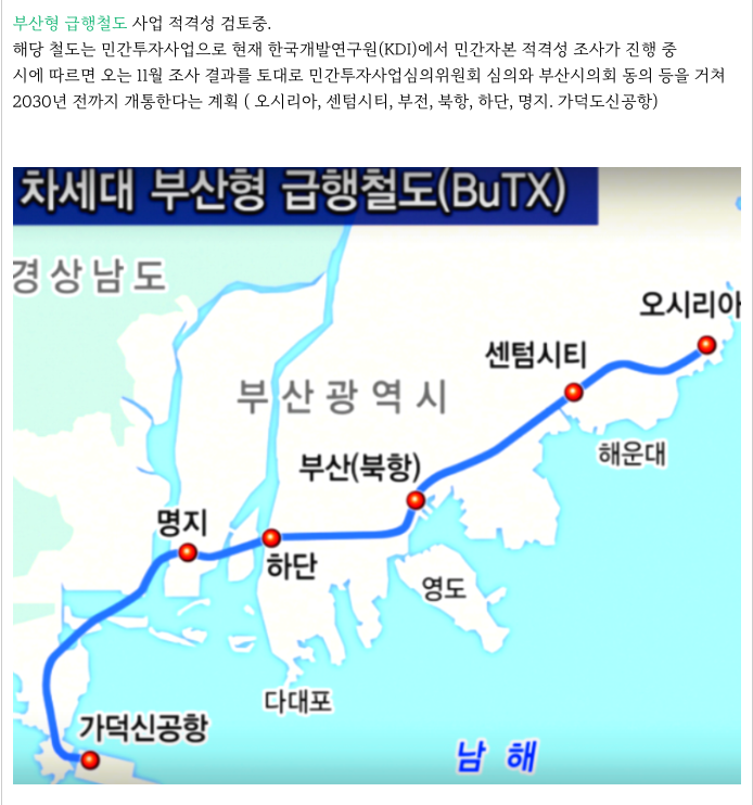 - 부산형급행열차(BuTX)는 2025년 하반기 착공을 목표로 지하 대심도로 가덕신공항, 하단역, 북항, 부전역, 오시리아로 연결되며 현재 KDI 민자 적격성 조사를 진행중에 있어