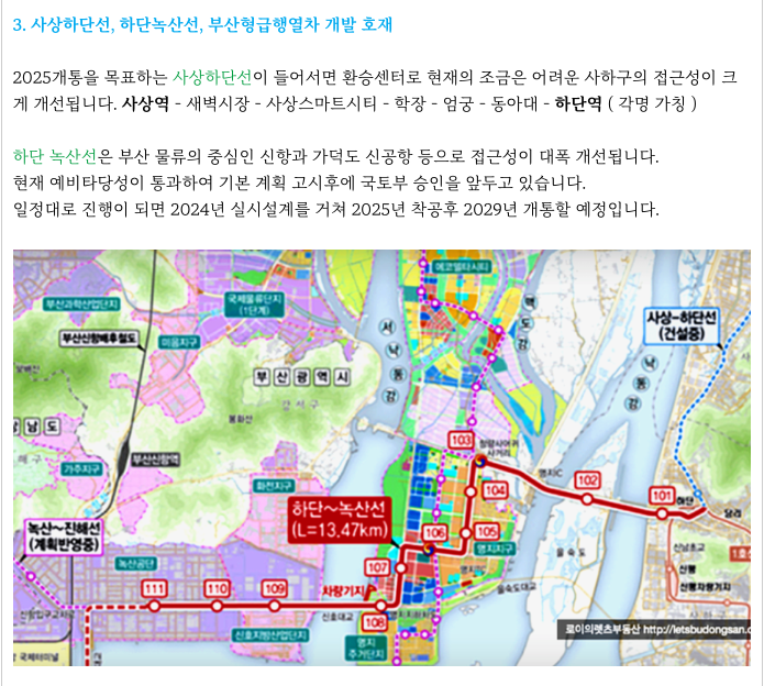 바로 2정거장 옆의 하단역이 교통의 중심 환승센터로 변모할 예정으로 접근성은 크게 개선될것입니다.