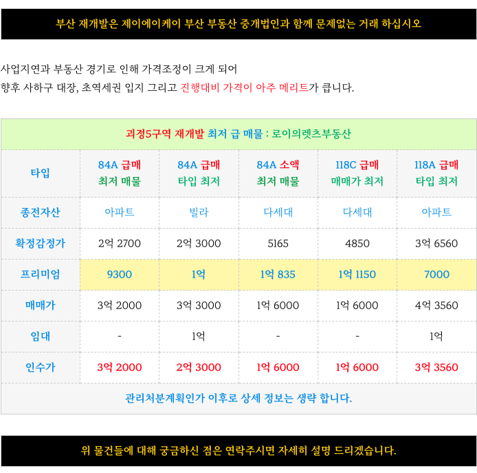 괴정5구역 재 금일 기준 매수 가능한 타입별 매물 소개해 드리곘습니다.