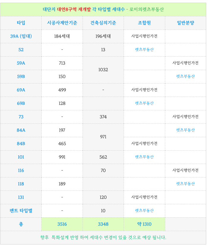대연8구역 현재 계획된 타입별 세대수 정리 드립니다.
