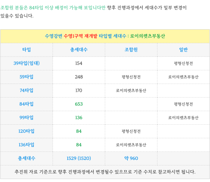 수영1구역 재개발 현재 예상 타입별 세대수 소개해 드립니다.