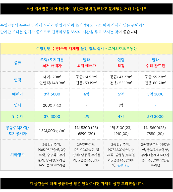 수영1구역 재개발 현재 가능한 최저 매물들 소개해 드리겠습니다.