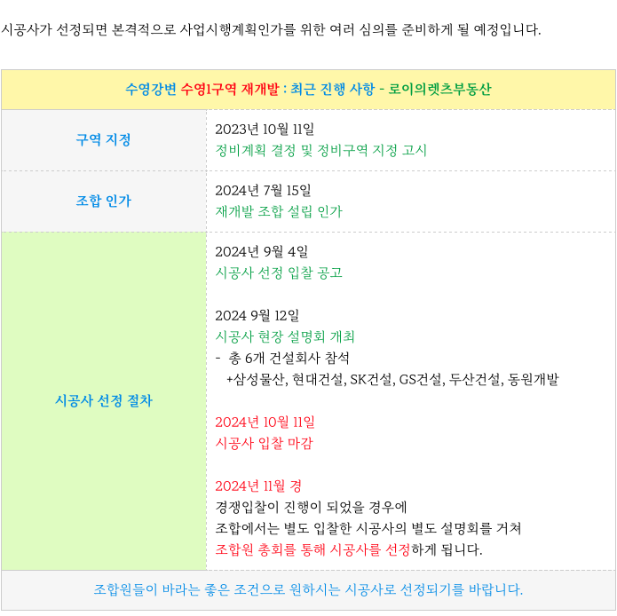 수영1구역 재개발은 시공사 선정 절차를 진행중에 있습니다.