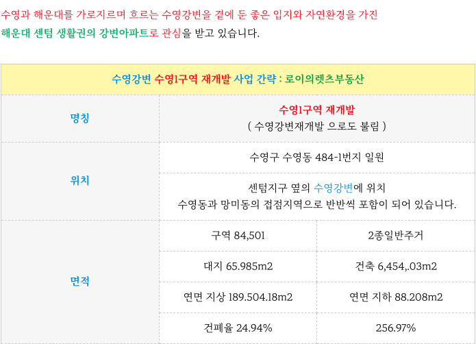 (수영강변) 수영1구역 재개발 : 시공사 선정중 & 현 가능 매물