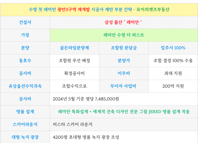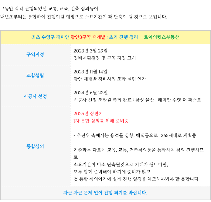 광안3구역 재개발 - 최초 수영구 래미안 - 현 최저 매물, 진행