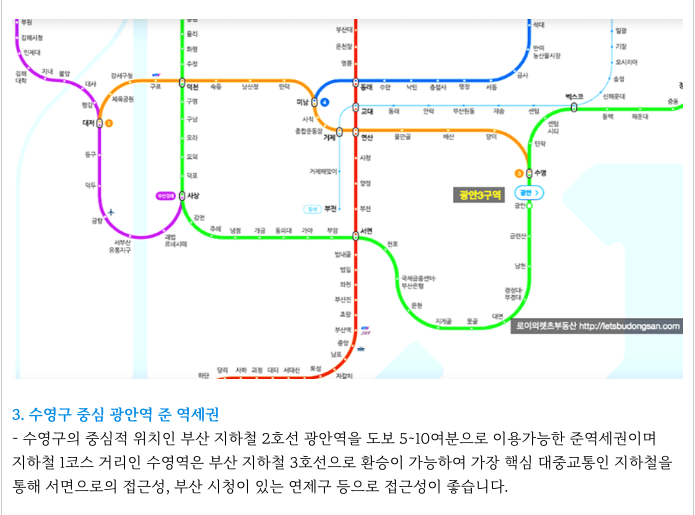 부산 지하철 2호선 광안역 도보 5 ~ 7분여 역세권 입니다.
