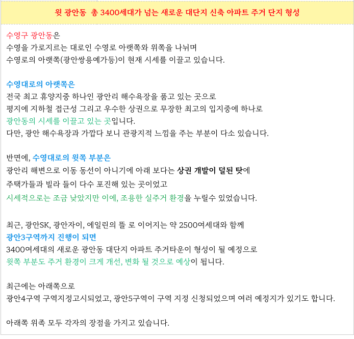 수영구 광안동의 현재 주변 변화 상황에 대해 간략하게 설명 드리겠습니다.