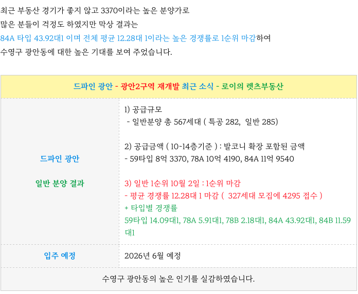 수영구 광안2구역 은 지난 10월 2일 있었던 일반 분양에서 1순위 마감 하였습니다.