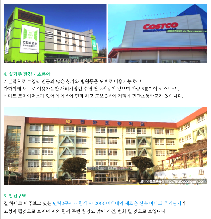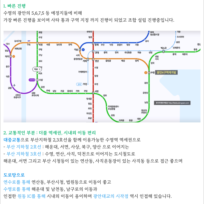- 수영역 더블 역세권 : 부산 지하철 2호선, 3호선 환승센터.