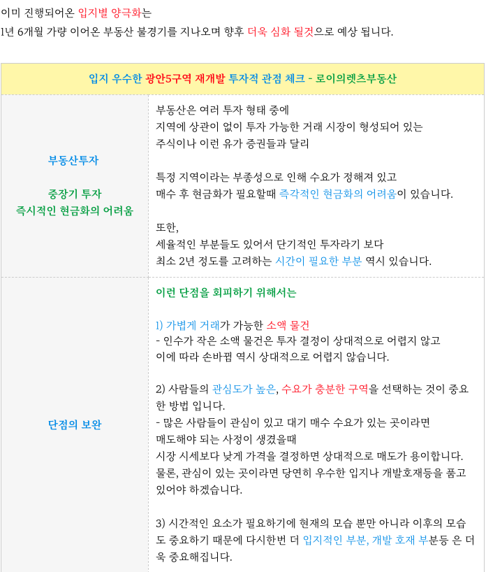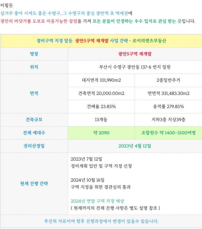 광안5구역 재개발 부동산 투자적 관점으로의 특징을 간략 소개 드립니다.