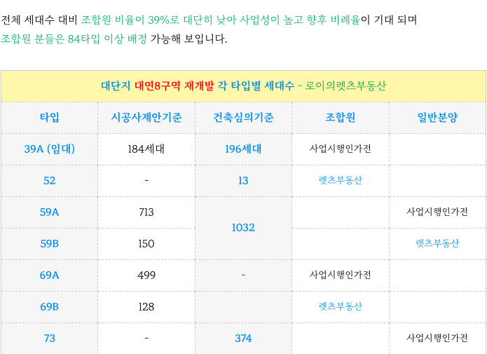 조합원 비율이 불과 39%로 낮아 사업성 좋고 향후 비례율 기대가 됩니다.