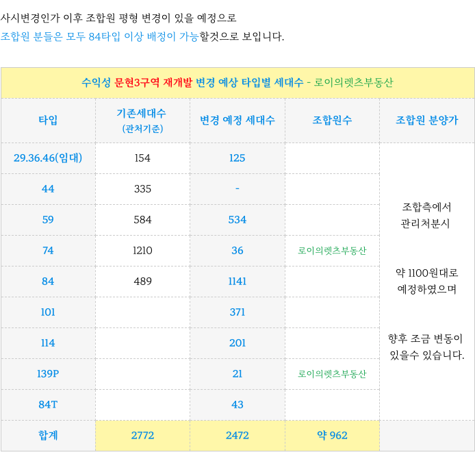 수익성 문현3구역 변경될 타입별 세대수 소개 드립니다.