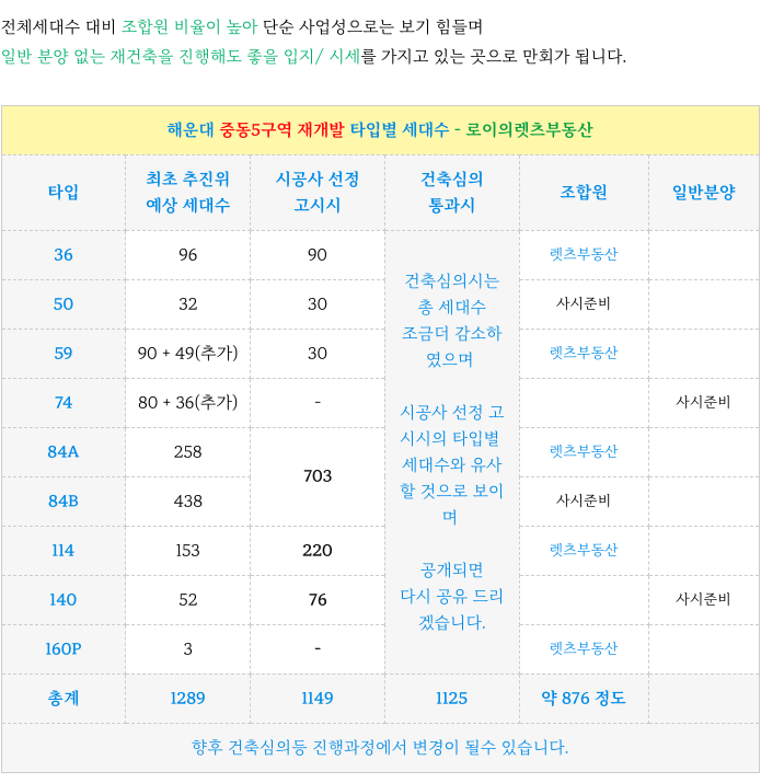 중동5구역 재개발 현재 계획된 각 타입별 세대수 정리하였습니다.