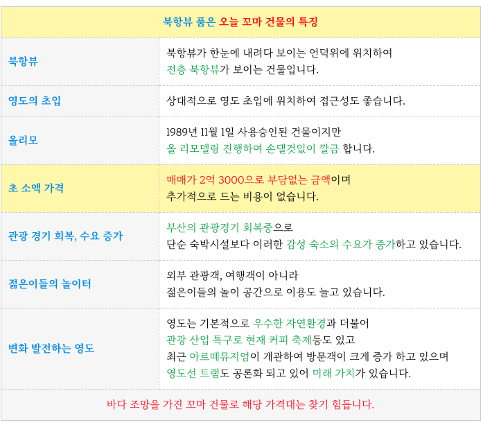 오늘 물건은 영도라는 감성 공간에, 중요한 북항뷰를 모두 품고 있는 건물입니다.
