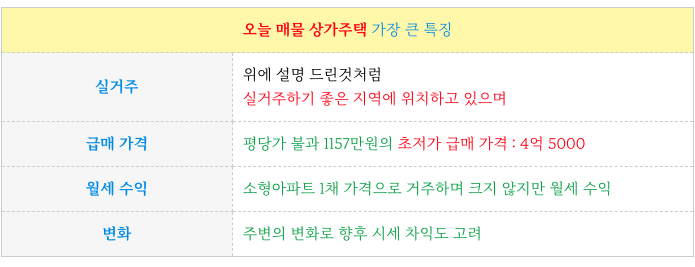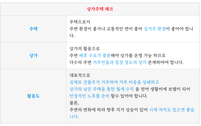 상가주택의 간략한 특징과 활용 부분 입니다.