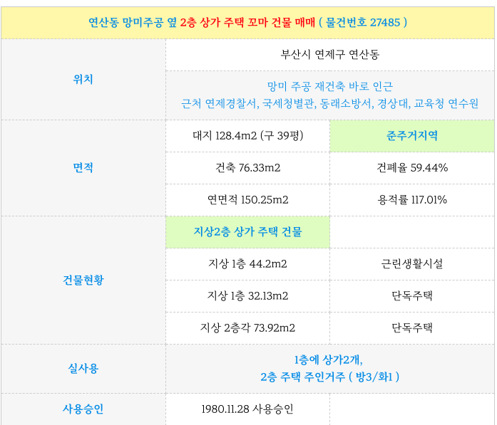 오늘 연산동 망미주공 옆 2층 상가 주택 꼬마 건물 매매 정리 해드립니다.