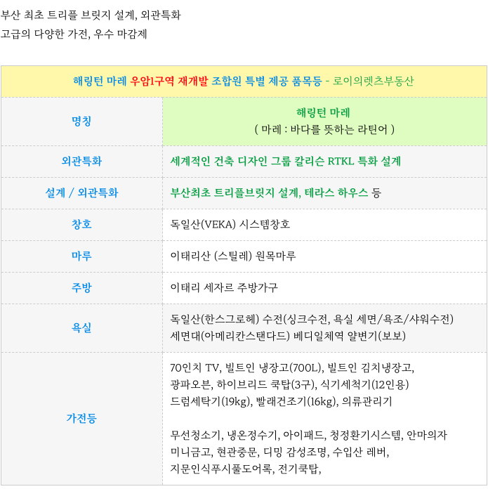 우암1구역 재개발 해링턴 마레 - 설계 특화와 다양한 조합원 제공 품목 정리하였습니다.