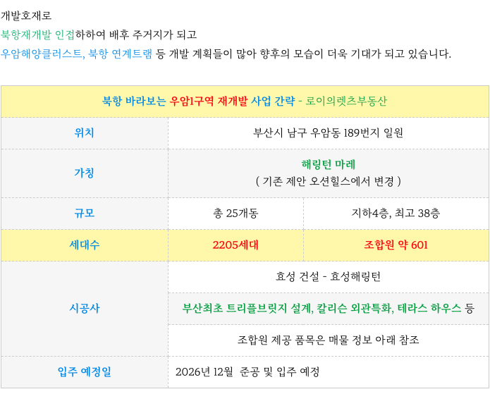 북항조망 : 해링턴 마레 : 바다 조망 조합원 입주권 매물 ( 우암1구역 재개발 2026.12 입주 )