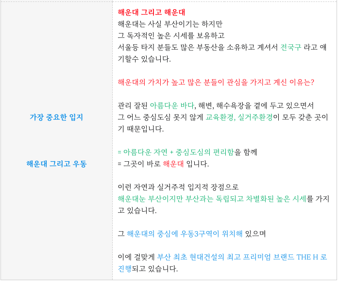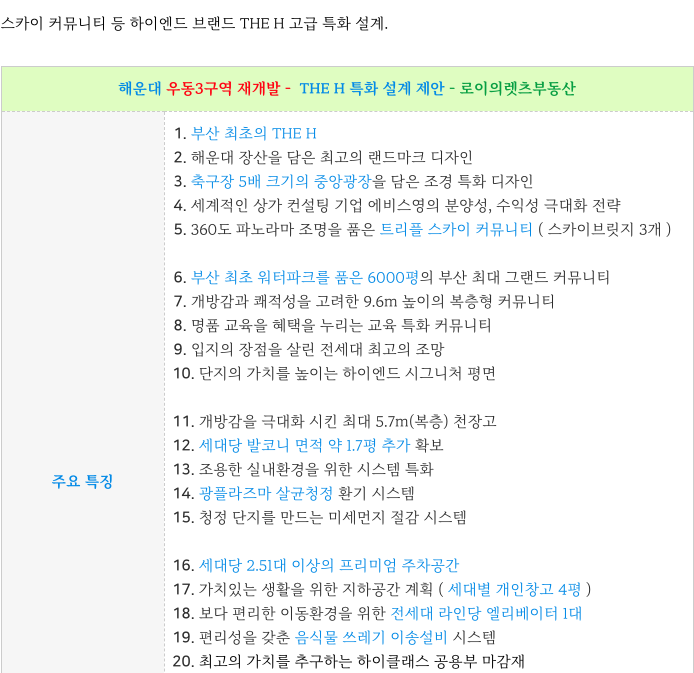 해운대 우동3구역 THE H 주요 제안 부분 소개해 드리겠습니다.
