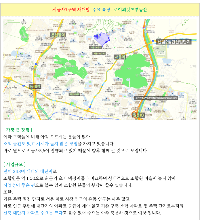 주변 이미 진행이 꽤된 서금사5,6구역으로 인해 상대적으로 관심을 덜 받아 시세가 낮은 것이 장점입니다.