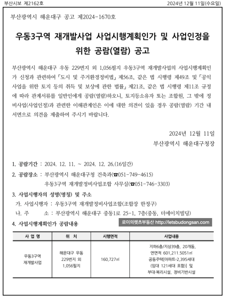 우동3구역 재개발 은 사업시행계획인가를 위한 공람을 완료하고 이제 사시 고시를 앞두고 있습니다.