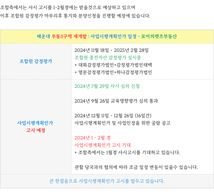 해운대 우동3구역 지금까지의 일자별 주요 진행 & 이후 절차 등 추가 정보는 아래 페이지를 참고 부탁드립니다.