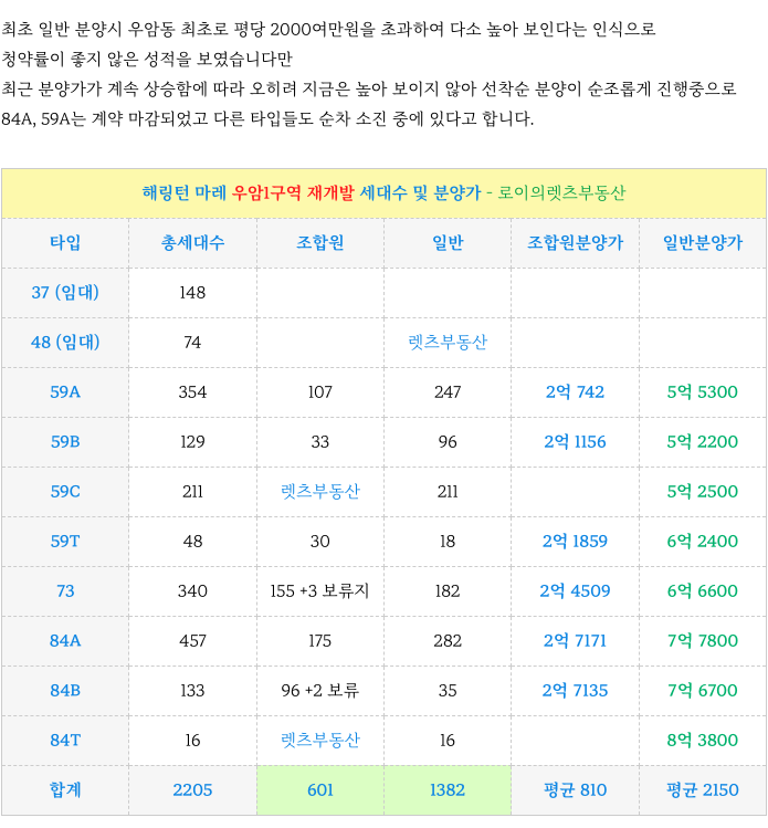 [해링턴마레] 조합원 입주권 타입별 현 매물 : 우암1구역 재개발